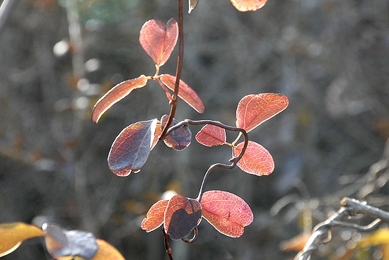 アケビの紅葉がはじまりました。 寒さに強いのか、一番最後の紅葉になります。 赤とか、黄色などのあでやかさに欠ける、赤紫です。 ちょっと地味ですが、陽射しが暖かそうでした。 |