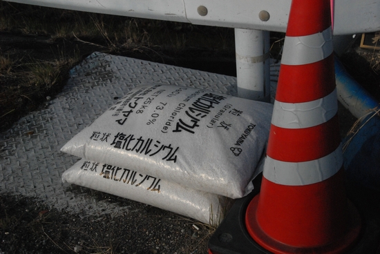 市道にかかる橋の脇に置かれた塩化カルシウム。 今回の雪では使用された形跡はありませんでした。 冬になると、凍結防止のために必ず配置してあって、誰が撒くのか気になっていました。 先日、点検に来た道路パトカーの乗務員に尋ねてみると、「誰が撒いても良いんですよ」との事で意外でした。